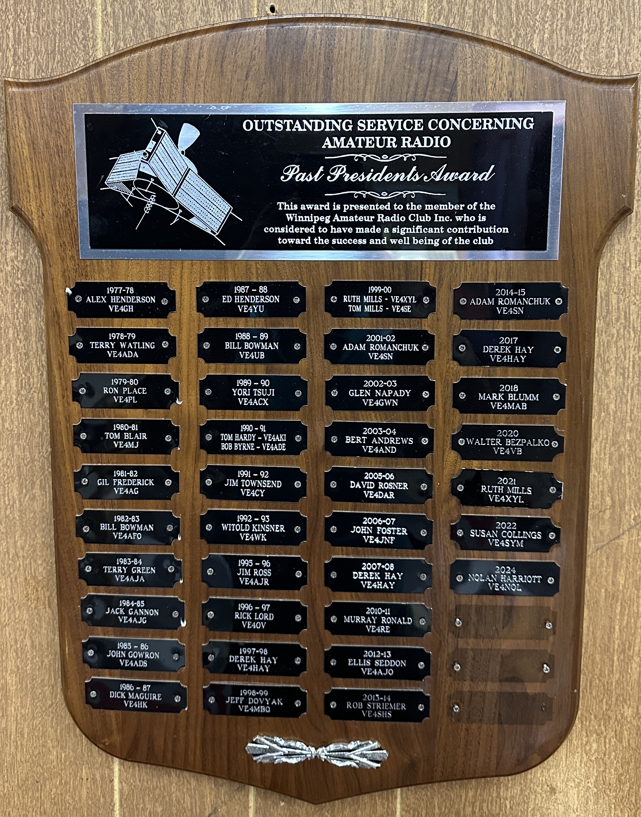 In 1977, the club wished to honour Alex Henderson VE4GH, who had made coffee for the WARC (predecesor club) meetings, seemingly forever, with no fanfare. The executive of the day first thought of a certificate of thanks. After some debate, we decided to go all out, and have a plaque made up for Alex. After more debate, the executive decided to award a plaque to a deserving ham, annually. The next problem was deciding the best title for the plaque