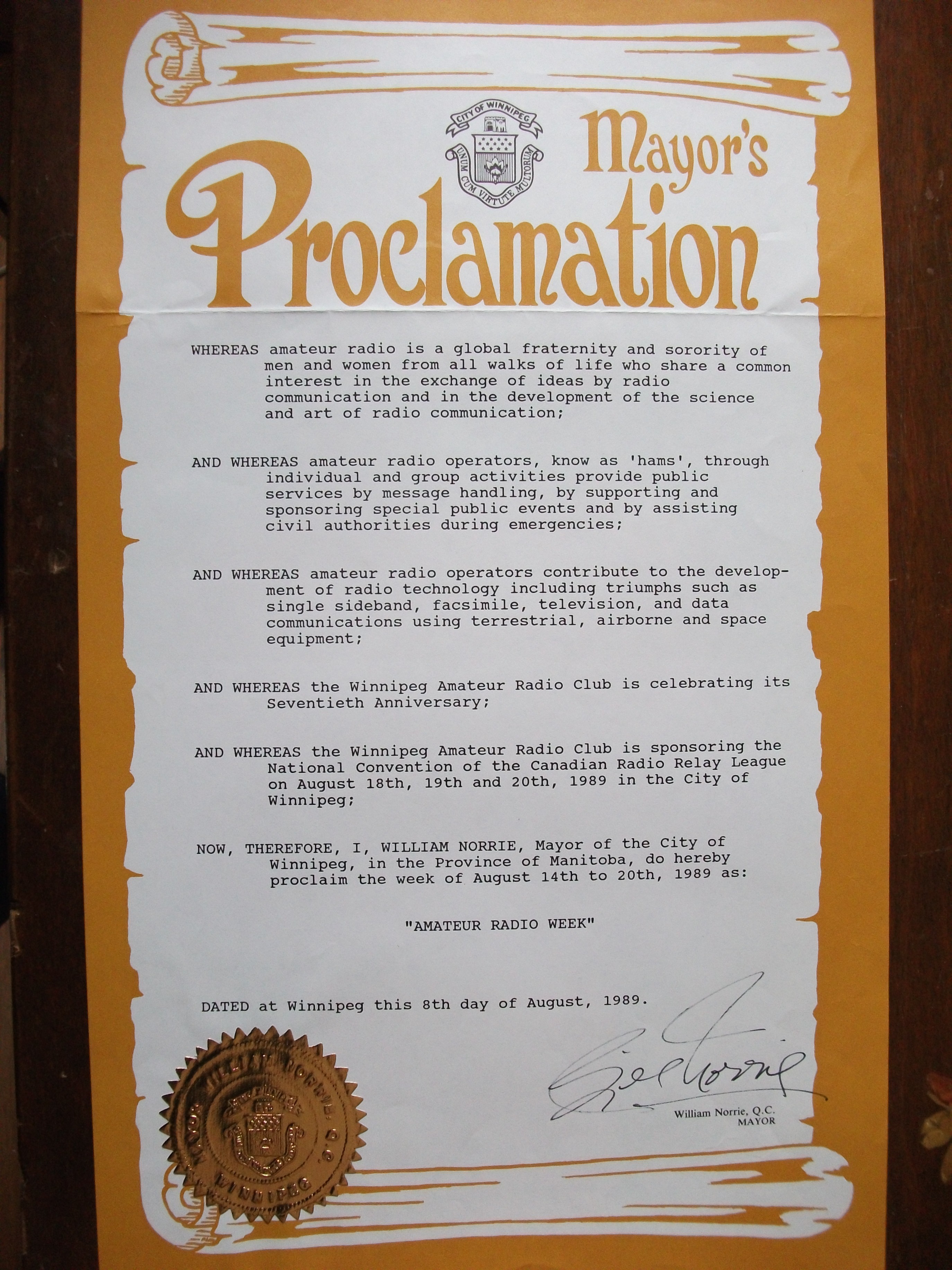 We competed for and won the hosting rights for the last Canadian Radio Relay League Convention ever held. CRRL later became part of the Canadian Amateur Radio Federation (CARF) the precursor to the Radio Amateurs of Canada (RAC). The Convention was held 1989 August 18, 19, and 20 at an hotel near the airport (it still is there but has been renamed at least twice). Mayor Bill Norrie and I knew each other from other civic projects. I asked him if the City would recognize the upcoming CRRL convention event. He declared the week of August 14 to 20 as “Amateur Radio Week”. By that time, our Executive slate had been replaced twice and the President during the convention was Dave Kovnats, VE4DBK, so I only was a bystander. My favorite memory of the Convention was the midnight induction into the Royal Order of the Wouff Hong.